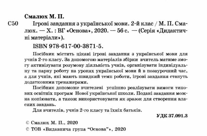 Ігрові завдання з української мови 2 клас НУШ Авт: Смалюх М.П. Вид-во: Основа 42830