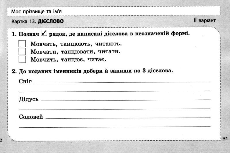 Посібник містить 16 карток у двох варіантах для проведення формувального оцінювання навчальних досягнень з української мови учнів 4-го класу.