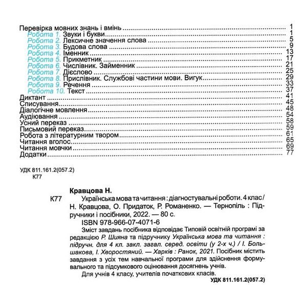 Діагностичні роботи. Українська мова та читання. 4 клас (до підручн. І. Большакової та ін.). НУШ Кравцова Н. Підручники і посібники