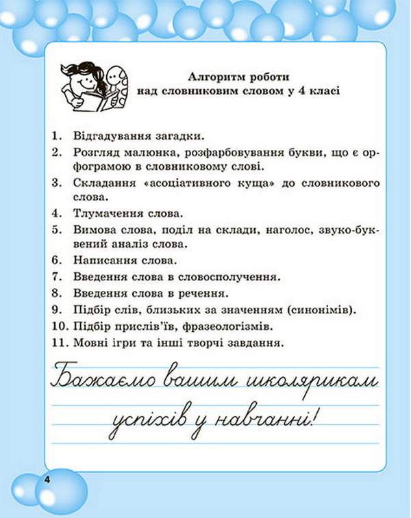 Посібник містить вправи спрямовані на вдосконалення каліграфічних і орфографічних навичок, розвиток творчої уваги, логічного та креативного мислення (складання “асоціативного куща” до словникового слова, тлумачення слова, відгадування загадки, підбір синонімів, прислів’їв, фразеологізмів), тощо.