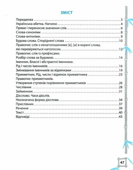 Під час виконання завдань учні поповнюють свій словниковий запас, досліджують мовні одиниці та явища, орфограми, опановують норми і правила українського правопису, а також практично здобувають навички грамотного письма. Наявність відповідей і підказок до завдань у кінці посібника сприяє розвитку самооцінки та самоконтролю учнів, а також є незамінним помічником для батьків під час контролю за навчанням дітей.