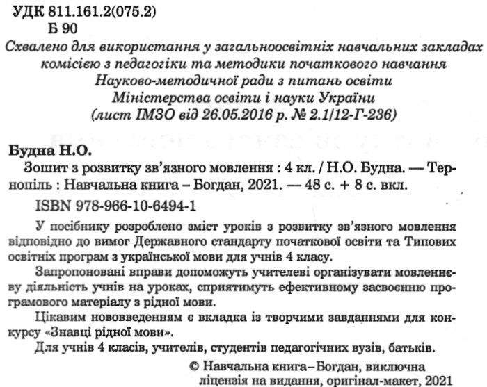 Зошит з розвитку зв’язного мовлення Українська мова Говоримо читаємо пишемо 4 клас НУШ Авт: Будна Н.О. Вид-во: Богдан 63083