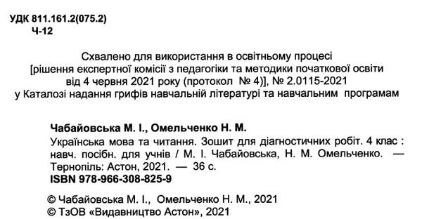 Українська мова та читання Зошит для діагностичних робіт 4 клас НУШ Чабайовська М. Омельченко Н. Астон