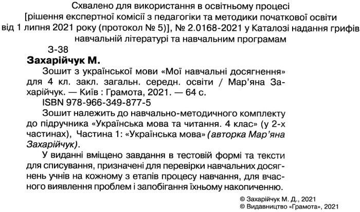 Нова українська школа Зошит з української мови Мої навчальні досягнення 4 клас НУШ Захарійчук М. Грамота. У виданні вміщено завдання в тестовій формі та тексти для списування, призначені для перевірки навчальних досягнень учнів на кожному з етапів процесу навчання, для вчасного виявлення проблем і запобігання їхньому накопиченню.