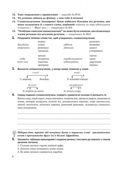 Робочий зошит з української мови охоплює весь програмовий матеріал для 6-го класу. Посібник відповідає оновленій навчальній програмі Міністерства освіти і науки України з української мови. Кожна тема містить різнорівневі вправи та завдання, короткі пояснення й закінчується підсумковою роботою. Вправи з ключами, кросворди та інші цікаві завдання допоможуть зробити процес вивчення та засвоєння необхідного матеріалу цікавим і доступним.