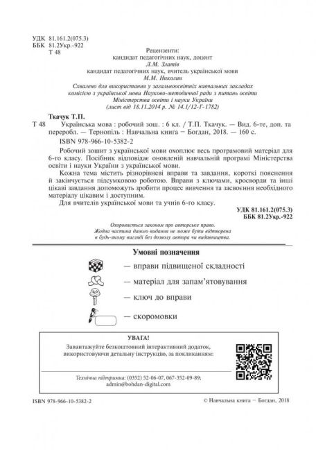 Робочий зошит Українська мова 6 клас Оновлена програма Авт: Ткачук Т. Вид: Богдан