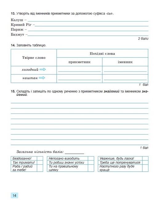 Крім оцінювання роботи за 12-бальною шкалою, учитель / учителька може висловити загальне враження від діяльності учнів / учениць. Для цього в кінці кожної роботи запропоновано словесні характеристики, біля яких учитель / учителька за бажанням поставить одну або кілька позначок.