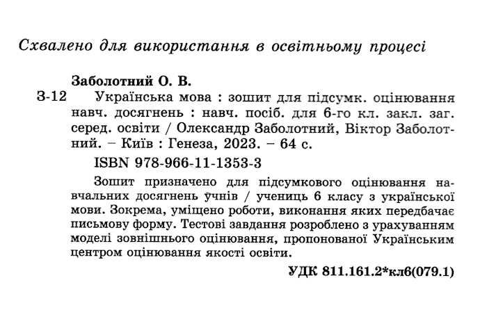 Зошит для підсумкового оцінювання навчальних досягнень Українська мова 6 клас НУШ Авт: В.В. Заболотний О.В. Заболотний Вид: Генеза 90505
