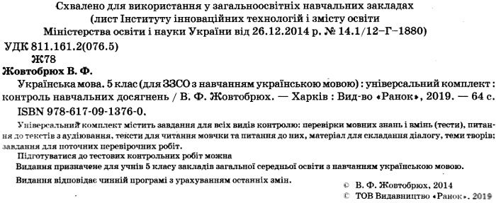 Контроль навчальних досягнень Українська мова 5 клас Українська мова навчання Жовтобрюх В. Ранок