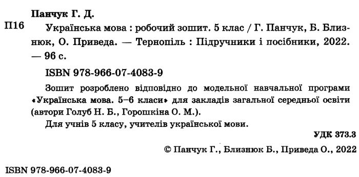 Робочий зошит Українська мова 5 клас НУШ За програмою Н. Голуб О. Горошкіної Авт: Панчук Г. Близнюк Б. Приведа О. Вид-во: Підручники і посібники 73393