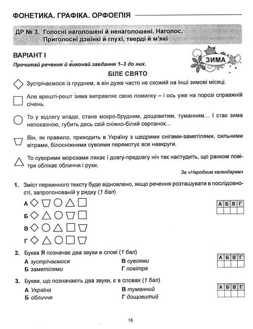 Навчальне видання орієнтовано на тематичне формування завдань до відповідної пори року, уподобань, творчості тощо; розроблено з урахуванням сучасних методик та моделі зовнішнього незалежного оцінювання.
