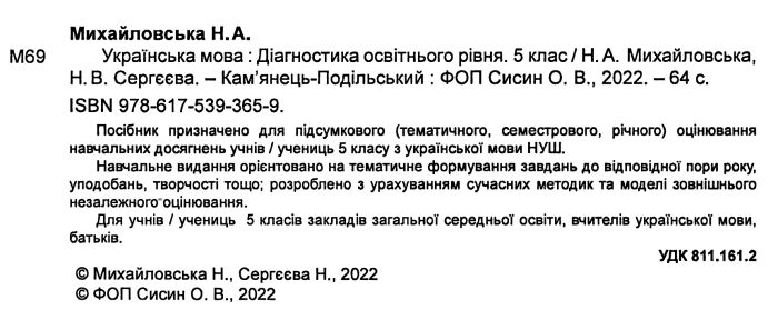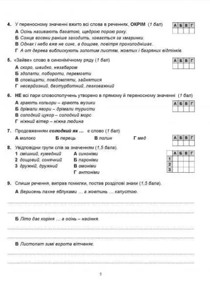 Посібник призначено для підсумкового (тематичного, семестрового, річного) оцінювання навчальних досягнень учнів / учениць 5 класу з української мови НУШ.