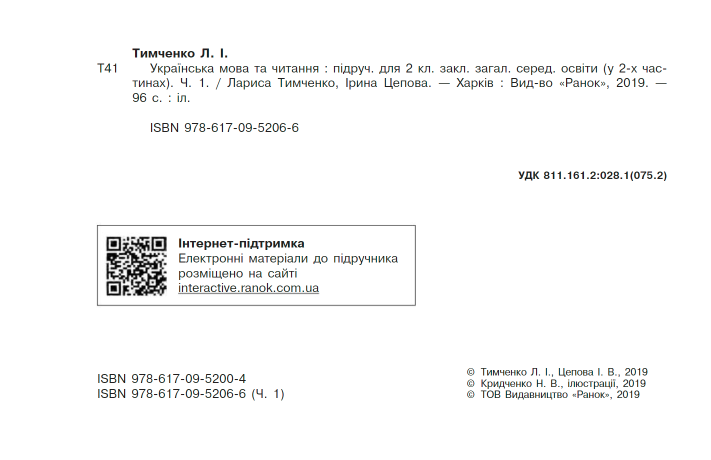 Підручник Українська мова та читання 2 клас Частина 1 НУШ Авт: Тимченко Л.І. Цепова І.В. Вид-во: Ранок 22535