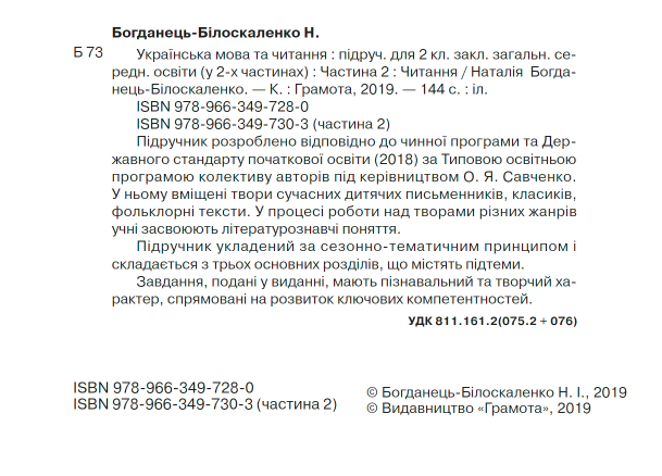 Підручник Українська мова та читання 2 клас Частина 2 НУШ Авт: Богданець-Білоскаленко Н.І. Вид-во: Грамота 22363
