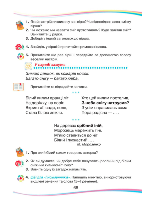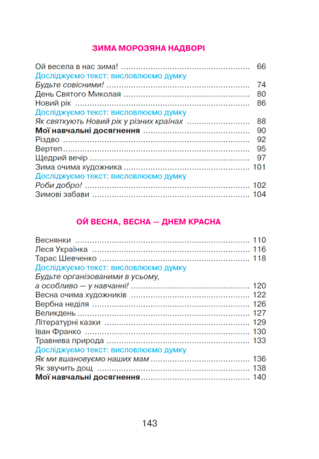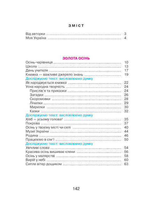 У ньому вміщені твори сучасних дитячих письменників, класиків, фольклорні тексти. У процесі роботи над творами різних жанрів учні засвоюють літературознавчі поняття. Підручник укладений за сезонно-тематичним принципом і складається з трьох основних розділів, що містять підтеми.