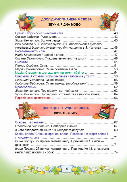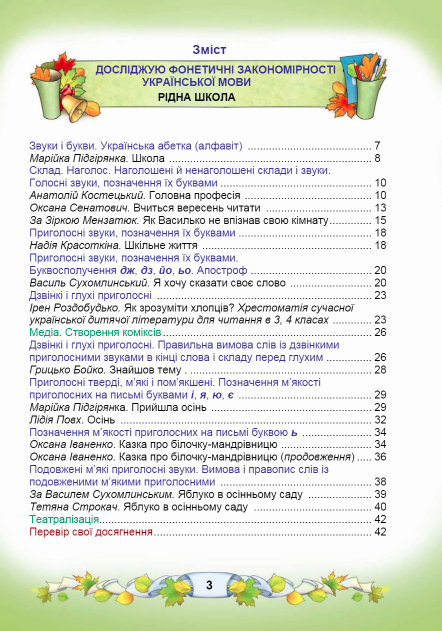 Матерiал пiдручника забезпечуе реалiзацiю таких змiстових лiнiй, як: «Взаемодiємо усно», «Читаємо», «Взаємодiємо письмово», «Дослiджуємо медiа», «Дослiджуємо мовлення», «Театралiзуємо», що сприяе формуванню мовленнєвих, мовних i читацьких умінь третьокласників.