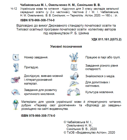 Нова українська школа Підручник Українська мова та читання 3 клас Частина 2 Чабайовська М. Омельченко Н. Синільник В. Астон. Пiдручник укладено зпдно з вимогами чинного Державного стандарту початково·i освiти та Типово·i освiтньо·i програми початково"i освiти колективу авторiв пiд керiвництвом Р. Б. Шияна.