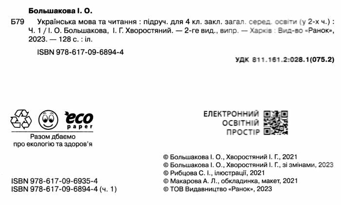 Підручник Українська мова та читання 4 клас Частина 1 НУШ Авт: Большакова І. Хворостяний І. Вид-во: Ранок 50099