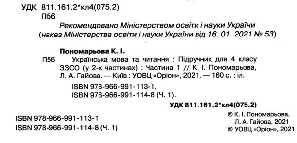 Підручник Українська мова та читання 4 клас Частина 1 НУШ Авт: Пономарьова К. Гайова Л. А. Вид-во: Оріон 50141
