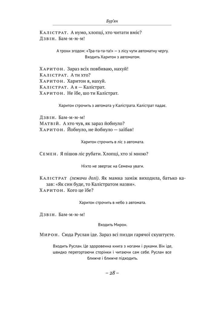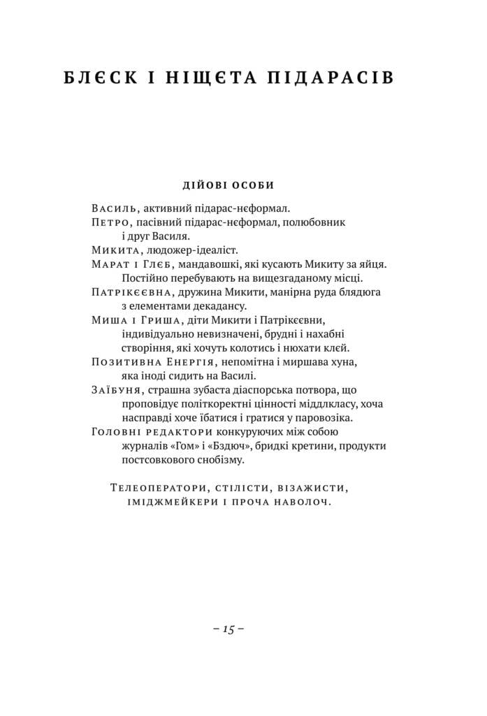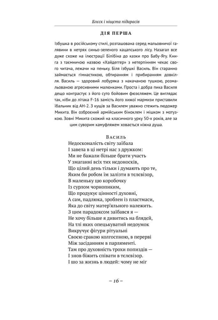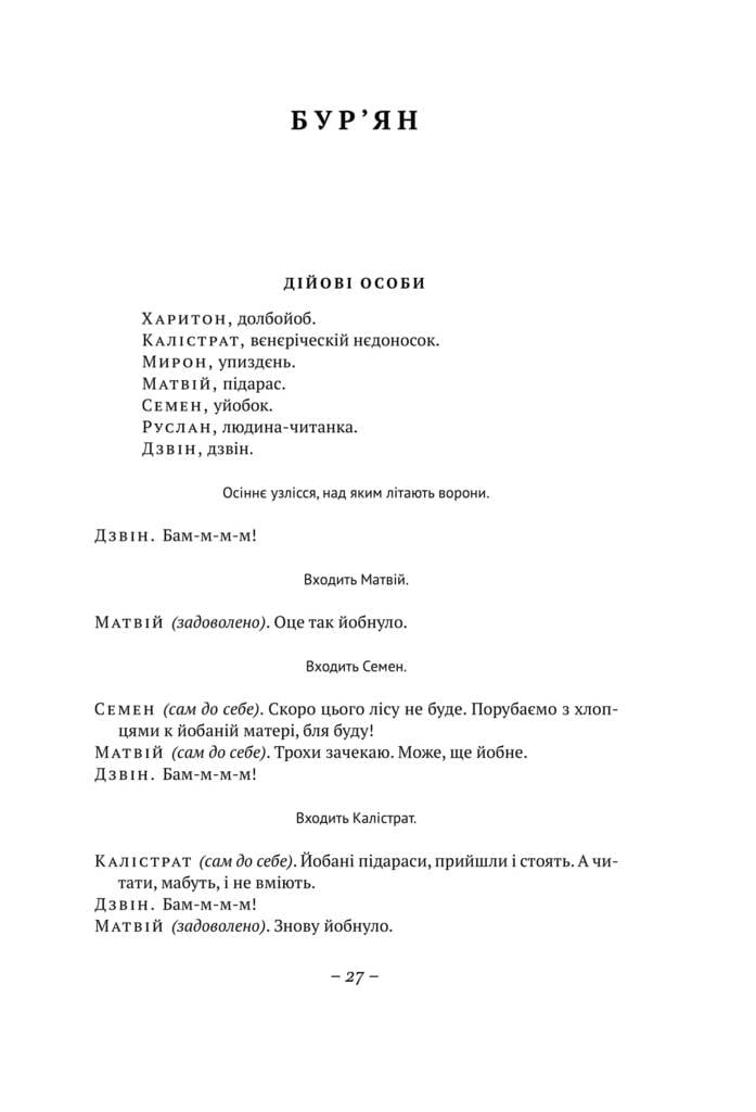 Када Лесь Подерв’янський переступав через бездиханне тіло великої Літератури, вона вдруг ожила; після того в них сталася преступна связь, і не одна. Про наслідки ніхто не думав. Герої і мутанти, історичні персонажі і класична нечисть, майстерні богошукачі й не менш пікантні бляді -над ними всіма ширяють ангели злословія, ковтають шпаги і безстижо блюють на солов’їв. Творчість Подерв’янського - се викоханий плід художньої поножовщини та халатної медицини. У його п’єсах підступний естетизм вискакує з кущів - пальто нарозхрист - і показує читачам геть усе: і Ніцше, і кацапів, і гімно.