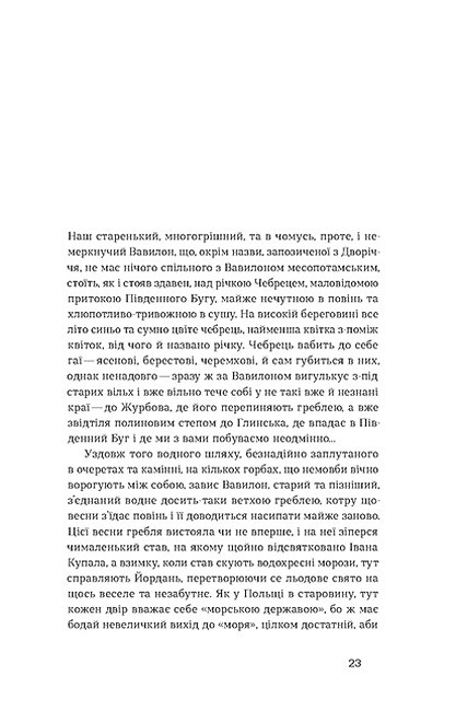 Старенький Вавилон на Побужжі, селяни, які викопують під грушею колекцію старовинної зброї, місцевий філософ, який читає Платона й розповідає про таврів і скіфів, гойдалка, побудована агентом з продажу швейних машинок «Зінґер», щоб видати доньок заміж, цап Фабіян, що стає задом до розстрільної бригади — все це сплітається у химерний роман на тлі чорторию великої історії.