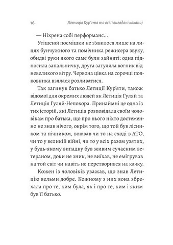 \n«Летиція Кур'ята та всі її вигадані коханці, яким вона збрехала про свого батька» — це суміш гумору, сарказму, поетичних алюзій, магічного реалізму і автобіографічної історії з елементами репортажу. І спроба описати вразливість у світі, де війна стає буденністю, а любов — рятівною ілюзією.