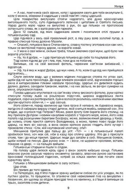 У книзі «Мотря» оповідається про кохання юної красуні Мотрі — дочки генерального судді Кочубея, пізніше страченого Мазепою, і гетьмана, який неухильно старіє. Дія відбувається на тлі важливих історичних подій.