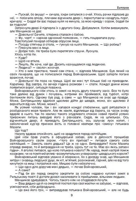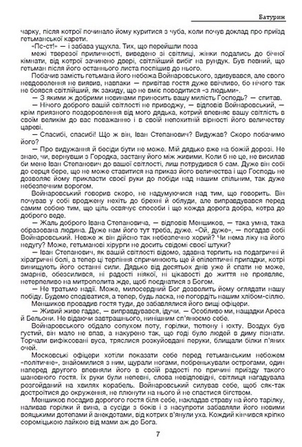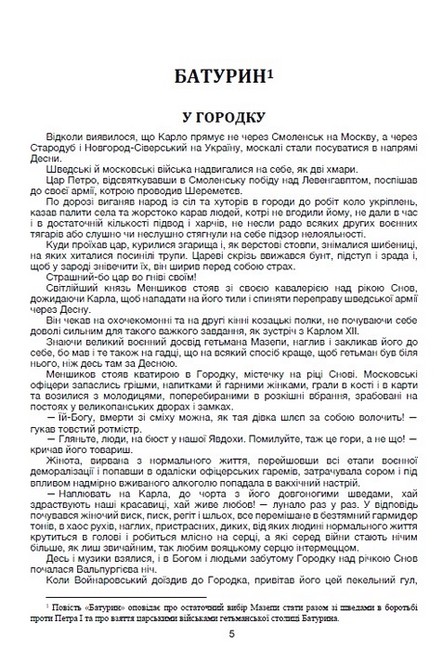 Повість «Батурин» оповідає про остаточний вибір Мазепи стати разом зі шведами в боротьбі проти Петра І та про взяття царськими військами гетьманської столиці Батурина.