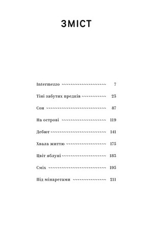 До збірки увійшли твори: «Intermezzo», «Тіні забутих предків», «Сон», «На острові», «Дебют», «Хвала життю», «Цвіт яблуні», «Сміх», «Під мінаретами».