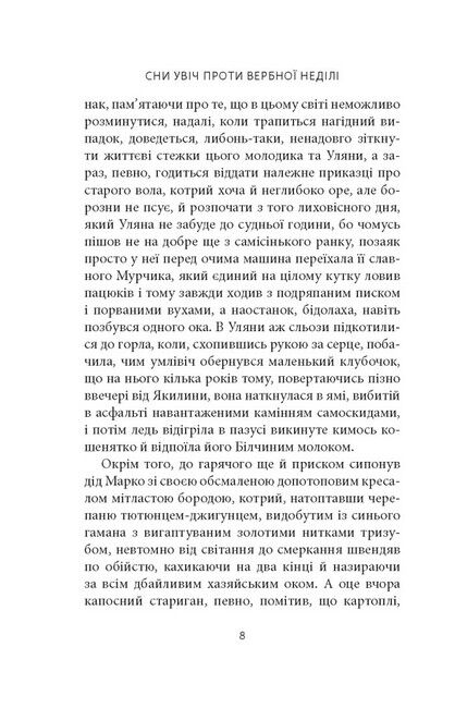 У романі «Сни увіч проти вербної неділі» реальність переплітається з химерними видіннями й спогадами головної героїні Уляни. Тридцять три сни, помережані прислів’ями, приказками, міфологічними ?бразами, присмачені словечками місцевих говірок, проводять читача крізь особисту родину історію, тісно пов’язану з трагічними обставинами життя українців у ХХ столітті. Це барокова суміш гротеску й драми, де смерть межує з еросом, містика — з неуникненною реальністю, віра в судьбу — з альтернативною версією розвитку подій. На початку роману в дім удови Уляни приходить квартирант Микола Іванович, який постійно замикається у своїй хатині і проводить там свої химерні експерименти. Чи вдасться йому завершити те, заради чого приїхав? Куди зник Володька зі давніх родинних світлин? І що це за дитина раптом з’явилася на подвір’ї Уляни, мов дві краплі води схожа на її давно померлого сина?