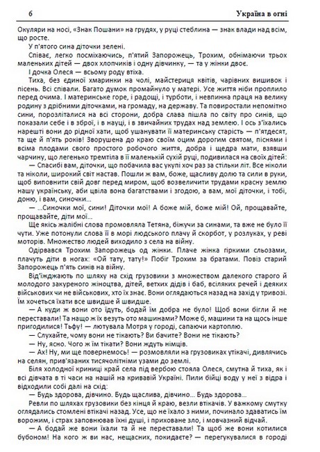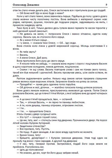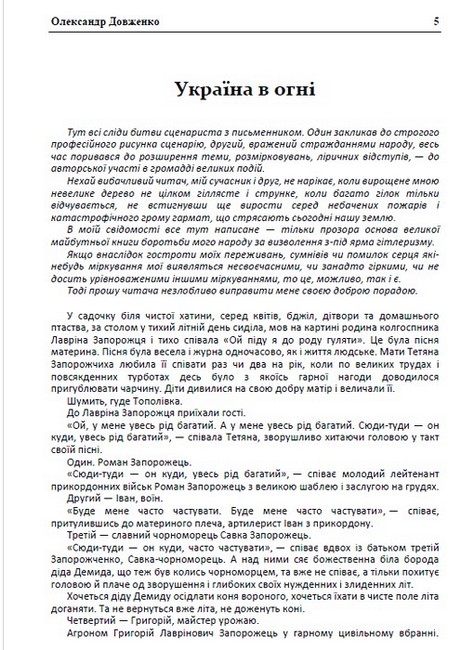 «Україна в огні» — драматична воєнна кіноповість. Автор як очевидець-фронтовик з надзвичайним драматизмом зображує воєнні жахіття, протиставляючи цій руйнації любов. «Ніч перед боєм» — оповідання, в основу якого покладено реальний бойовий епізод, що демонструє героїзм народу і війська. «Зачарована Десна» — романтична кіноповість, присвячена спогадам автора про мальовничу красу природи рідного краю. Твори є обов’язковою частиною шкільної програми. Олександр Довженко — видатний український письменник і кінорежисер, автор кіноповістей «Україна в огні», «Зачарована Десна», «Поема про море», «Антарктида», фільмів «Звенигора», «Земля» тощо.