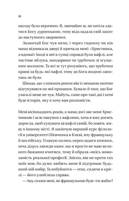 Вісімнадцятирічна Христина, як і мріяла, вступила до київського вишу. Нарешті вона опинилася у новому місті, де може розправити крила та подорослішати, зануритися у студентське життя, навчитися по-справжньому дружити й знайти кохання. Перші дорослі виклики, досягнення, розчарування, спроби балансувати між роботою та навчанням. Проте… звичайні для інших речі даються Христині непросто. Є в її житті те, про що вона мовчить, про що нікому не скаже, бо, здається, про це краще мовчати довіку. Чи зможе вона вибратися із клітки, яку вибудував її розум, і відкритися світу?