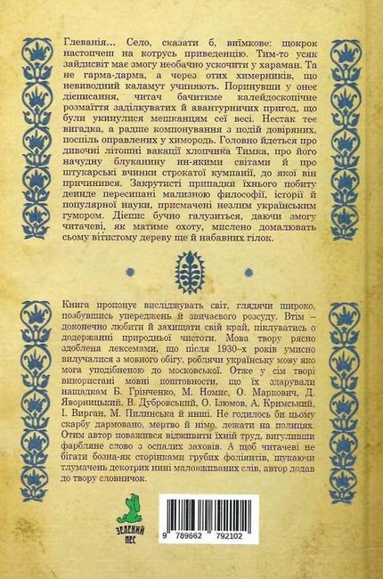 Глеванія... Село, сказати б, виїмкове: щокрок настопчеш на котрусь приведенцію. Тим-то усяк зайдисвіт має змогу необачно ускочити у хараман. Та не гарма-дарма, а через отих химерників, що невиводний каламут учиняють. Поринувши у онеє дієписання, читач бачитиме калейдоскопічне розмаїття заділкуватих й авантурничих пригод, що були укинулися мешканцям сеї весі. Нестак теє вигадка, а радше компонування з подій довіряних, поспіль оправлених у химородь. Головно йдеться про дивочні літошні вакації хлопчика Тимка, про його начудну блуканину ин-якими світами й про штукарські вчинки строкатої кумпанії, до якої він причинився. Закрутисті припадки їхнього побиту деинде пересипані мализною философії, історії й популярної науки, присмачені незлим українським гумором. Дієпис бучно галузиться, даючи змогу читачеві, як матиме охоту, мислено домалювать сьому вітистому дереву ще й набавних гілок. Книга пропонує висліджувать світ, глядячи широко, позбувшись упереджень й звичаєвого розсуду.
