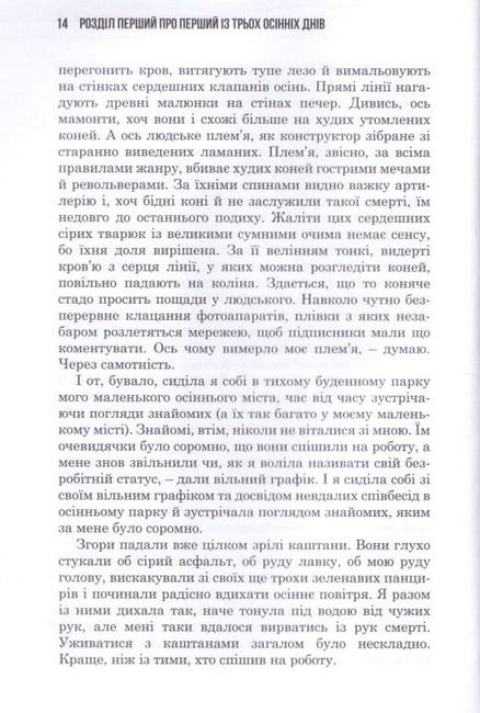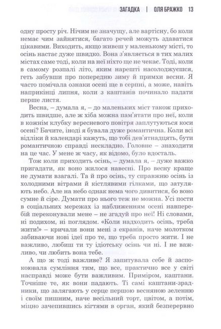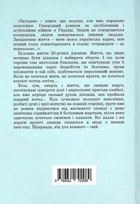 «Загадка» – книга про молоде, але вже поранене покоління. Своєрідний реквієм за загубленими і згубленими війною в Україні. Звідти не повертаються колишніми, звідти повертаються іншими людьми. Знецінення життя – наче якась українська карма, мов вічний голос психотерапевта в голові: «страждати – це нормально…». Буденне життя 20-річної дівчини. Життя, що лише починає бути цікавим і набирати обертів. І ось коли героїня стає настільки близькою, що співчуваєш усім її переживанням через безробіття та безсоння, трохи впізнаючи в ній себе, відбувається переломний момент. Коли не хочеться жити, не хочеться мріяти, не хочеться взагалі чогось хотіти… Біль, сум, смерть і життя, що завжди поруч, неочікувані повороти долі і карколомні пригоди слабкої, але вже апріорі сильної духом дівчини, яка пройшла перший котел... Біль сучасного молодого покоління, розбиті душі і мрії відчутні на кожній сторінці, проте вже не можна відірватися від витіюватої оповіді з дещо цинічним сприйняттям й болісними жартами...