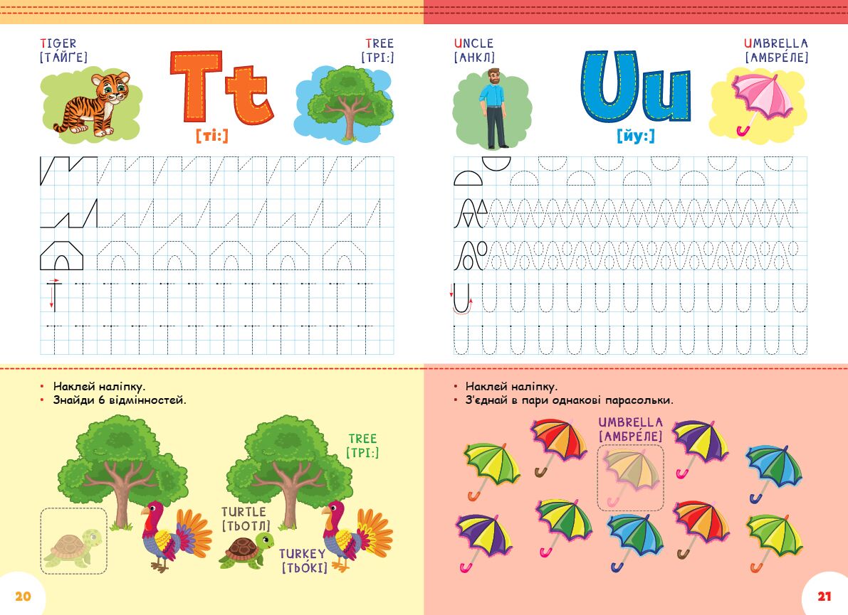 "«Абетка з прописами та завданнями» — це яскраво ілюстрована тематична абетка, завдання якої спрямовані на вивчення букв, знайомство з новими словами, підготовку руки до письма і власне письмо літер. Видання допоможе малюкові вивчити букви англійського алфавіту й цифри та навчитися їх писати. Щоб закріпити здобуті знання, дитина має виконати захопливі завдання: знайти й навести букви на малюнках, провести дітей і тварин стежками й лабіринтами до цілі, знайти відмінності й з’єднати в пари однакові речі, полічити смаколики, а також виконати безліч інших вправ на логіку, лічбу та письмо. Граючись і виконуючи завдання за допомогою наліпок, малюк покращить координацію рухів рук, розвине дрібну моторику, уяву та логічне мислення, а робота з прописами навчить дитину концентрувати увагу та сформує впевнені графічні навички, потрібні для подальшого успішного навчання в школі.