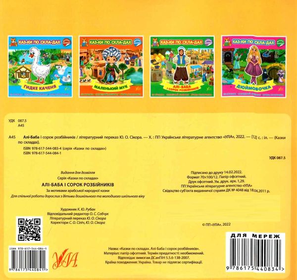 Що може бути цікавішим за класичну, знану багатьма поколіннями казку «Алі-Баба і сорок розбійників»? Тільки казка, у якій поєднуються захопливий сюжет, безліч наліпок, тематичний лабіринт і 2D іграшка, а всі слова поділено на склади. Читання — важливий і складний етап навчання. І саме улюблені казки допоможуть зробити його цікавим й успішним. Видання призначене для дітей старшого дошкільного та молодшого шкільного віку