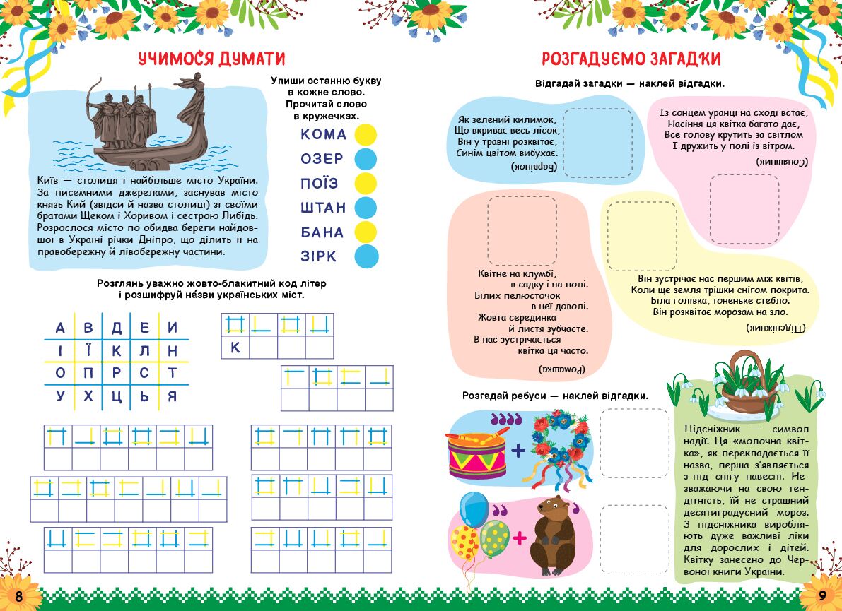 Любов до Батьківщини, як і до родини, з’являється і виховується змалечку. Захоплення красою рідної землі, насолода від милозвучності мови, повага до символів і пам’яток, турбота про ближнього, гордість за українське проростають з усвідомленням себе частинкою країни. Ця книжка допоможе в цьому й відкриє цікаві горизонти пізнання, запропонує незвичні завдання на українську тематику, розраховані на дітей від 7 років, — кросворди, загадки, ребуси, шифрограми, судоку, розмальовку, лабіринт, завдання для розвитку уваги, покращання дикції та тренування пам’яті.