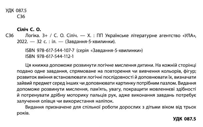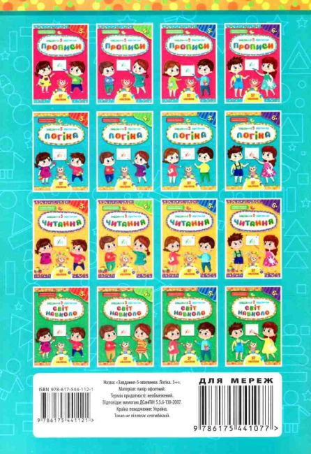 "Серія «Завдання-5-хвилинки» створена для гармонійного розвитку дитини від 2 до 6 років. Чотири лінійки серії — «Прописи», «Логіка», «Світ навколо», «Читання» — укладені відповідно до віку дитини та програм дошкільного розвитку. Цікаві завдання, виконання яких потребує орієнтовно 5 хвилин, спрямовані на те, щоб малюк встиг дізнатися щось нове чи повторити те, що знає, а головне — отримати задоволення від навчання.