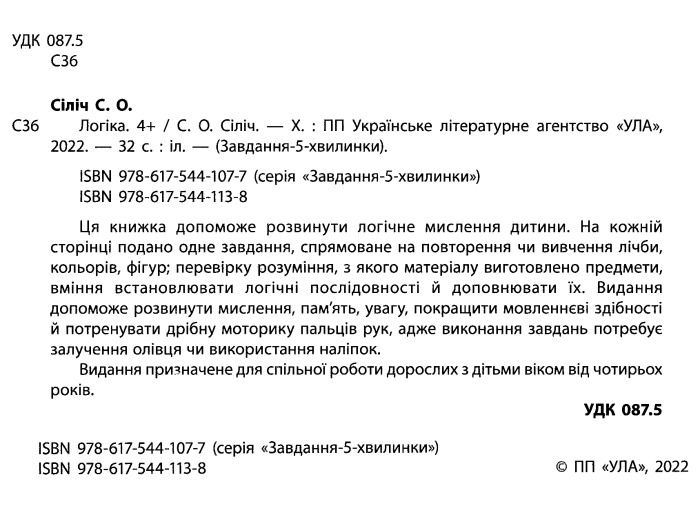 Купити Завдання-5-хвилинки - Логіка. 4 . Сіліч С. О. Ула. в інтернет-магазині Knigovo.org.ua. Ця книга містить вправи з логіки для дітей від 4 років, які розвивають мислення та увагу. Ваша дитина зможе розвивати свої навички та вміння, розвиваючи мислення та логічне мислення з допомогою цієї книги.