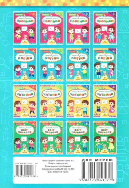 "Серія «Завдання-5-хвилинки» створена для гармонійного розвитку дитини від 2 до 6 років. Чотири лінійки серії — «Прописи», «Логіка», «Світ навколо», «Читання» — укладені відповідно до віку дитини та програм дошкільного розвитку. Цікаві завдання, виконання яких потребує орієнтовно 5 хвилин, спрямовані на те, щоб малюк встиг дізнатися щось нове чи повторити те, що знає, а головне — отримати задоволення від навчання.