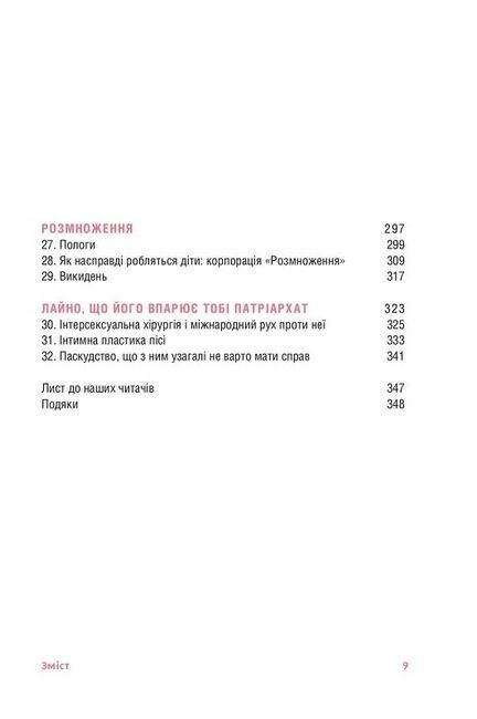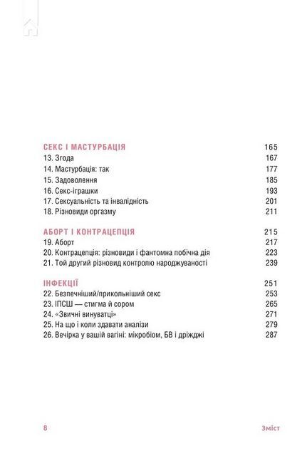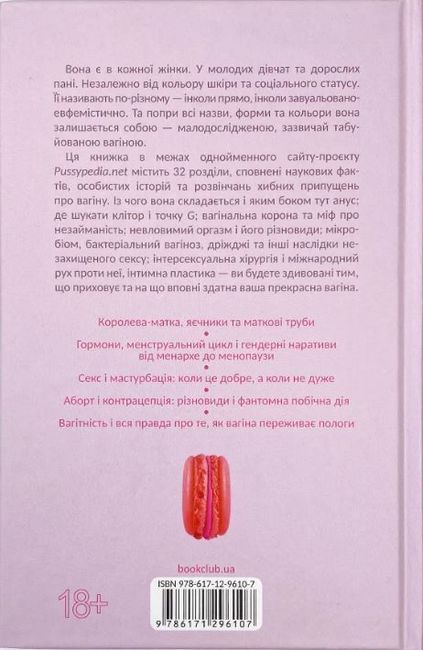 Ця книжка, в межах однойменного сайту-проекту Pussypedia, містить аж 30 розділів, сповнених наукових фактів, особистих історій та розвінчань хибних припущень про вагіну. З чого вона складається і яким боком тут анус, де шукати клітор і точку G, вагінальна корона (а також міф про незайманість), невловимий оргазм та його види, мікробіом, бактеріальний вагіноз, дріжджі та інші наслідки незахищеного сексу, інтерсексуальна хірургія і міжнародний рух проти неї, інтимна пластика — ви будете здивовані тим, що приховує та на що вповні здатна ваша прекрасна вагіна.