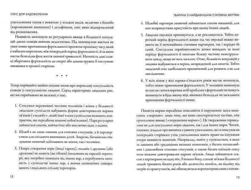Чому люди щодо багатьох важливих аспектів сексуального життя радикально відрізняються від своїх найближчих предків - людиноподібних мавп? Чому в жінок, на відміну від самок майже всіх інших видів ссавців, настає менопауза? А чому чоловіки на противагу переважній більшості інших самців після запліднення своєї пари зазвичай залишаються з нею та допомагають виховувати дітей? Зрештою, з якої причини людський пеніс має невиправдано великий розмір?