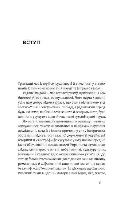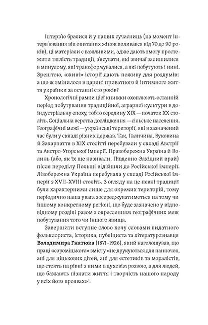 У своїй новій книжці етнологиня Ірина Ігнатенко розповідає історію інтимних стосунків в українських традиціях. Яких чоловіків і жінок українці вважали красивими та бажаними, як знайомилися й до яких засобів «зваблення» вдавалися? У що одягалися наші прапрабабусі та як календар релігійних свят впливав на розклад гігієнічних процедур і секс? Які обмеження на інтимні стосунки були навіть у шлюбі? Чому замовчували зради та як по розбитих горщиках визначали майбутню кількість дітей?