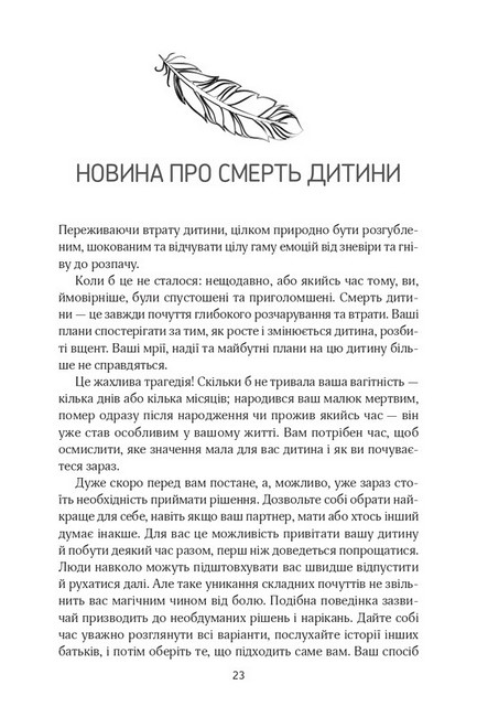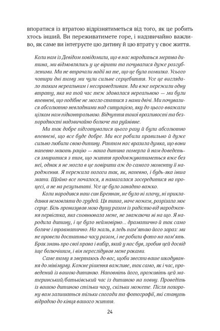 Незалежно від того, коли відбулася сумна подія, ця книжка запропонує втіху та надію. Авторка розкриває такі теми, як повернення до роботи і до життя, скорботу подружжя, почуття провини, народження ще однієї дитини, самотність.