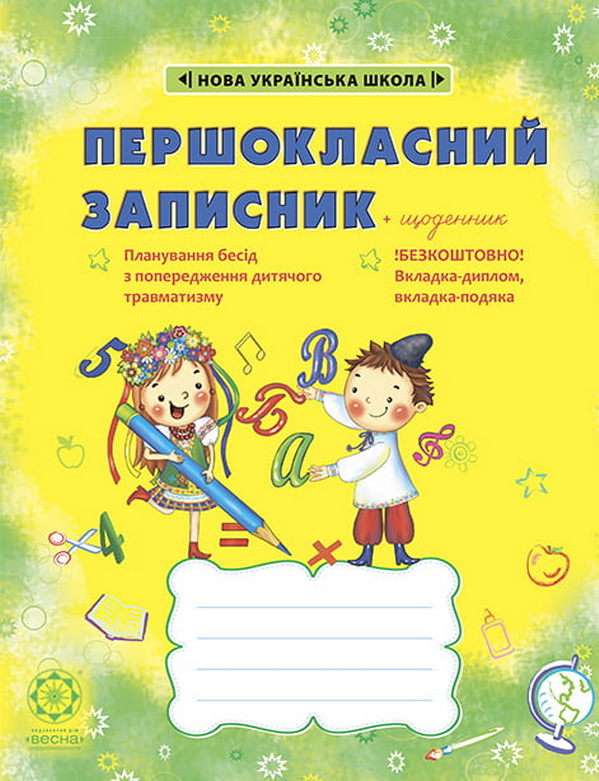 Нова українська школа Першокласний записник +щоденник 1 клас Гребенькова Л. НУШ Весна. ПЕРШОКЛАСНИЙ ЗАПИСНИК+ щоденник — це невід’ємний атрибут школяра та зворотній зв’язок між вчителем і батьками. У ньому учень/учениця, (в першому класі вчитель/вчителька, або батьки) записуватиме розклад занять і сторінки, які вивчалися на уроці.