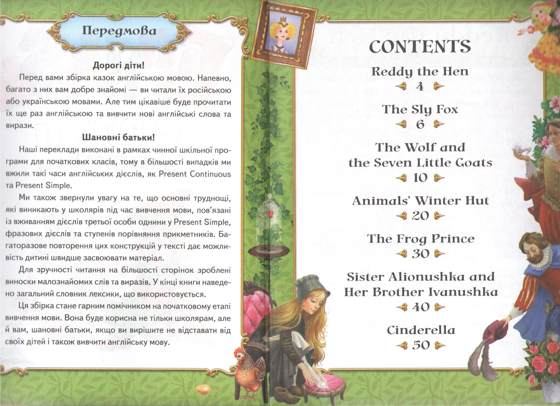 В сборник вошли следующие сказки: «Курочка Ряба», «Хитрый лис», «Волк и семеро козлят», «Зимовье зверей», «Король-лягушонок», «Сестрица Алёнушка и братец Иванушка», «Золушка».