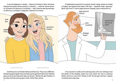 За допомогою цієї книги діти залюбки побувають на роботі Марійчиної мами — в лікарні. Ця книга допоможе з вивченням слів англійською, які стосуються частин тіла та зовнішності людини.