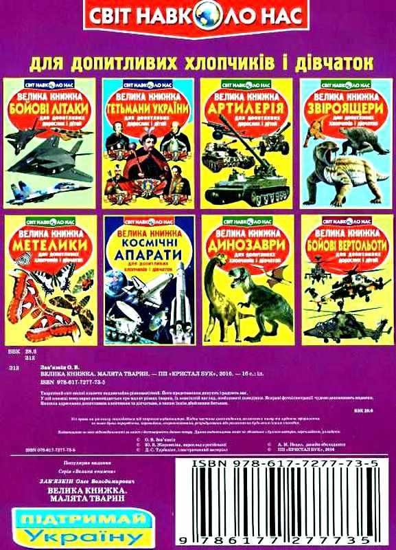 Велика книжка Малята тварин Світ навколо нас Крістал Бук. Тваринний світ нашої планети Надзвичайно різноманітній. Его представник дівують и радують нас.У Цій книжці популярно розповідається про малят різніх тварин, їх Зовнішній вигляд, Особливості поведінкі.