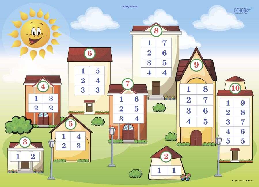 Комплект містить 5 кольорових, двосторонніх плакатів. • Склад числа 3; • Склад числа 4; • Склад числа 5; • Склад числа 6; • Склад числа 7; • Склад числа 8; • Склад числа 9; • Склад числа 10; • Склад чисел 2-10.