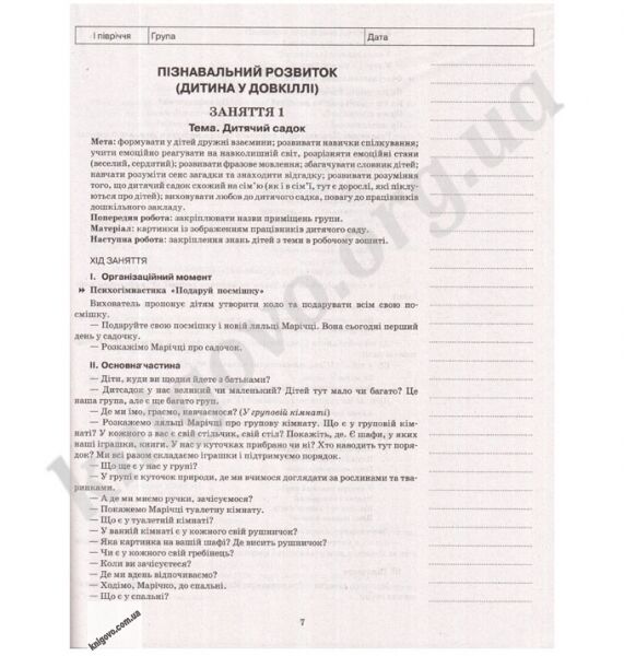 Задля зручності використання всі розробки розміщено на відривних аркушах. Поля для записів дадуть змогу творчому вихователеві, користуючись запропонованим у посібнику матеріалом, скласти власні конспекти занять.